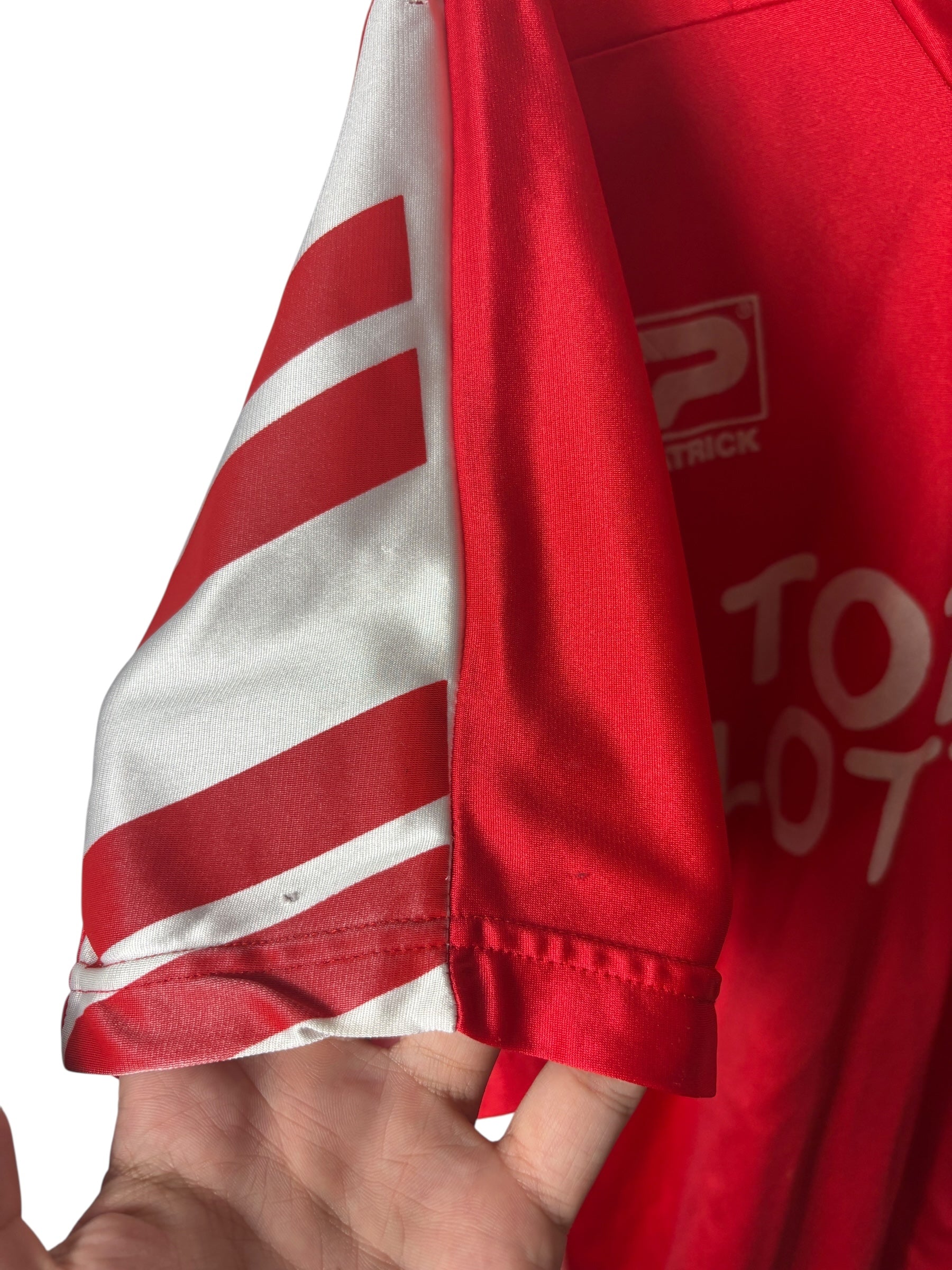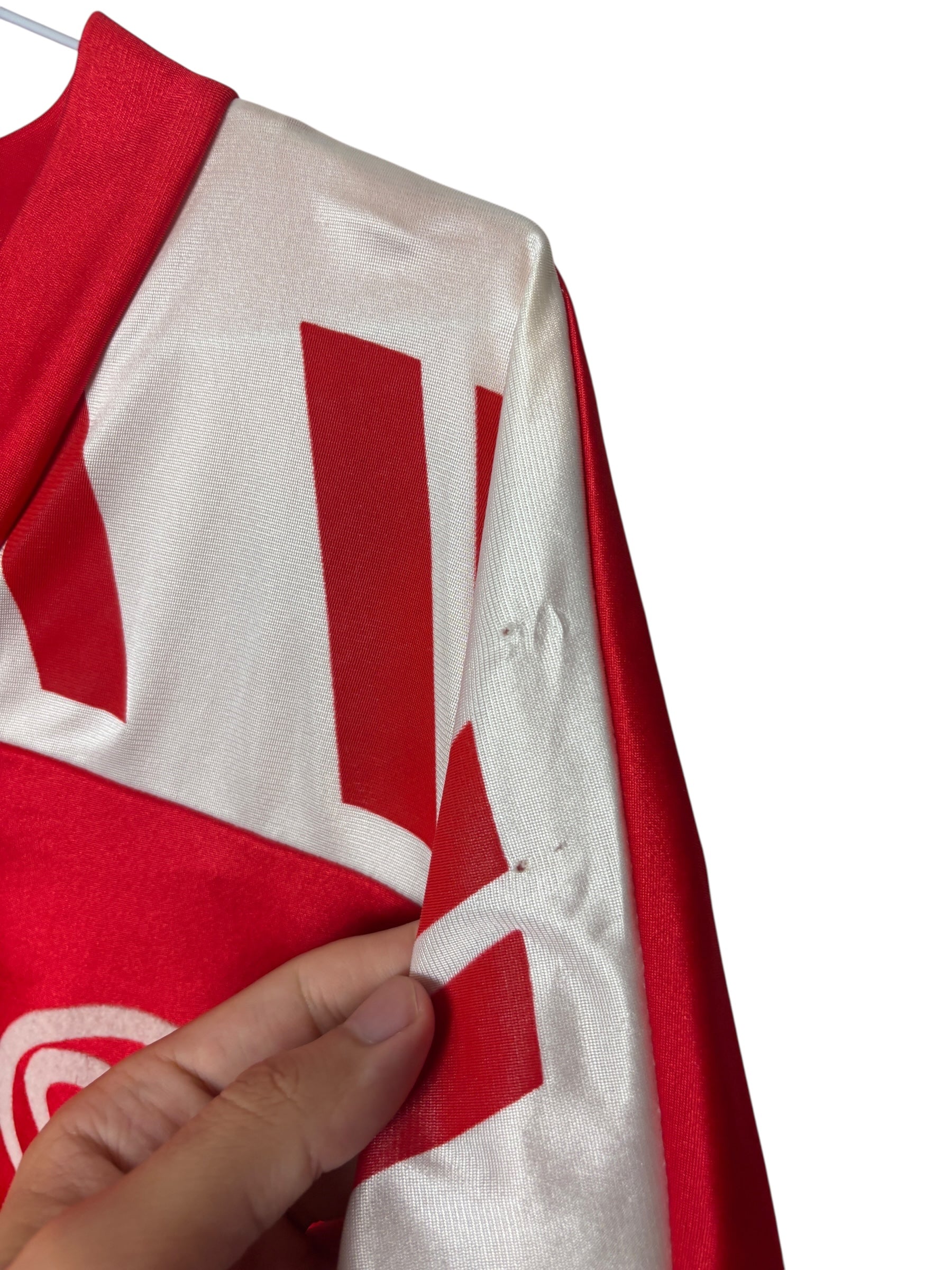 Es handelt sich um ein getragenes Original-Trikot. Leichte Gebrauchsspuren oder kleinere Mängel können altersbedingt vorhanden sein – diese sind nach bestem Wissen in der Artikelbeschreibung aufgeführt und auf den Fotos detailliert festgehalten.