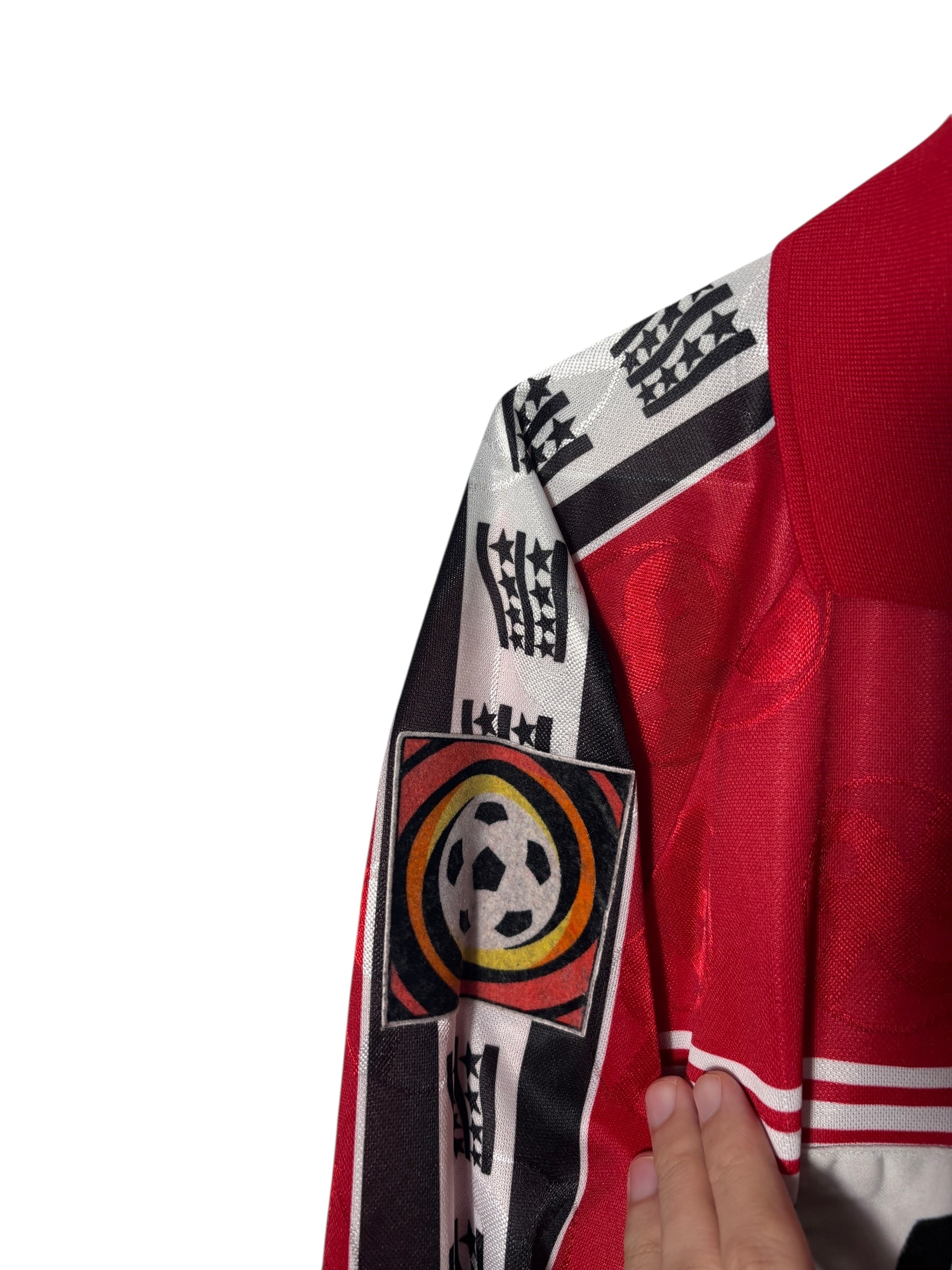 Es handelt sich um ein getragenes Original-Trikot. Leichte Gebrauchsspuren oder kleinere Mängel können altersbedingt vorhanden sein – diese sind nach bestem Wissen in der Artikelbeschreibung aufgeführt und auf den Fotos detailliert festgehalten.