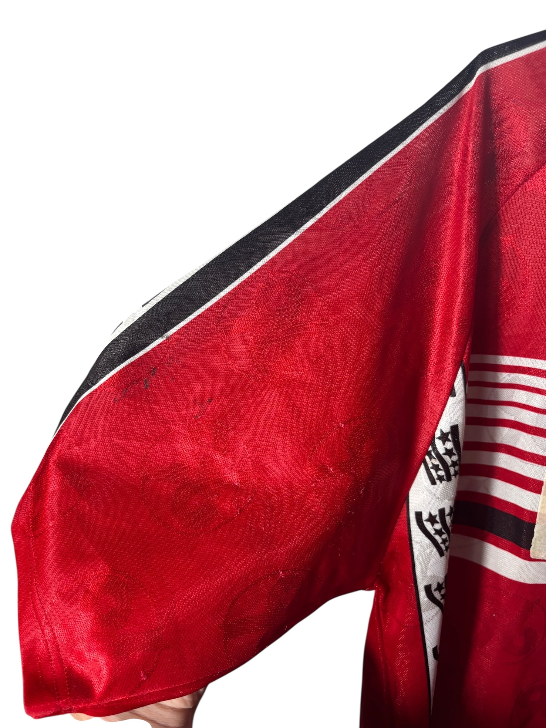 Es handelt sich um ein getragenes Original-Trikot. Leichte Gebrauchsspuren oder kleinere Mängel können altersbedingt vorhanden sein – diese sind nach bestem Wissen in der Artikelbeschreibung aufgeführt und auf den Fotos detailliert festgehalten.
